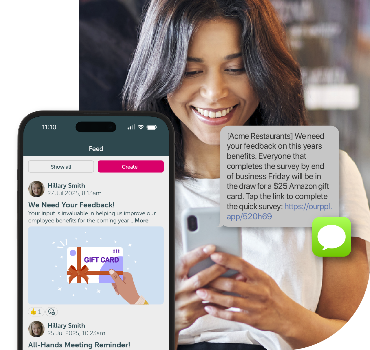 Reach employees via Text, email or in-app. They can engage from any device - no passwords or app installs needed.