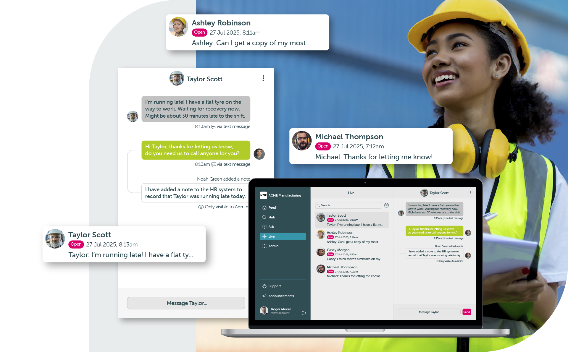 Incoming questions are visible to managers in Live View. Add internal notes, collaborate, and close messages when resolved.