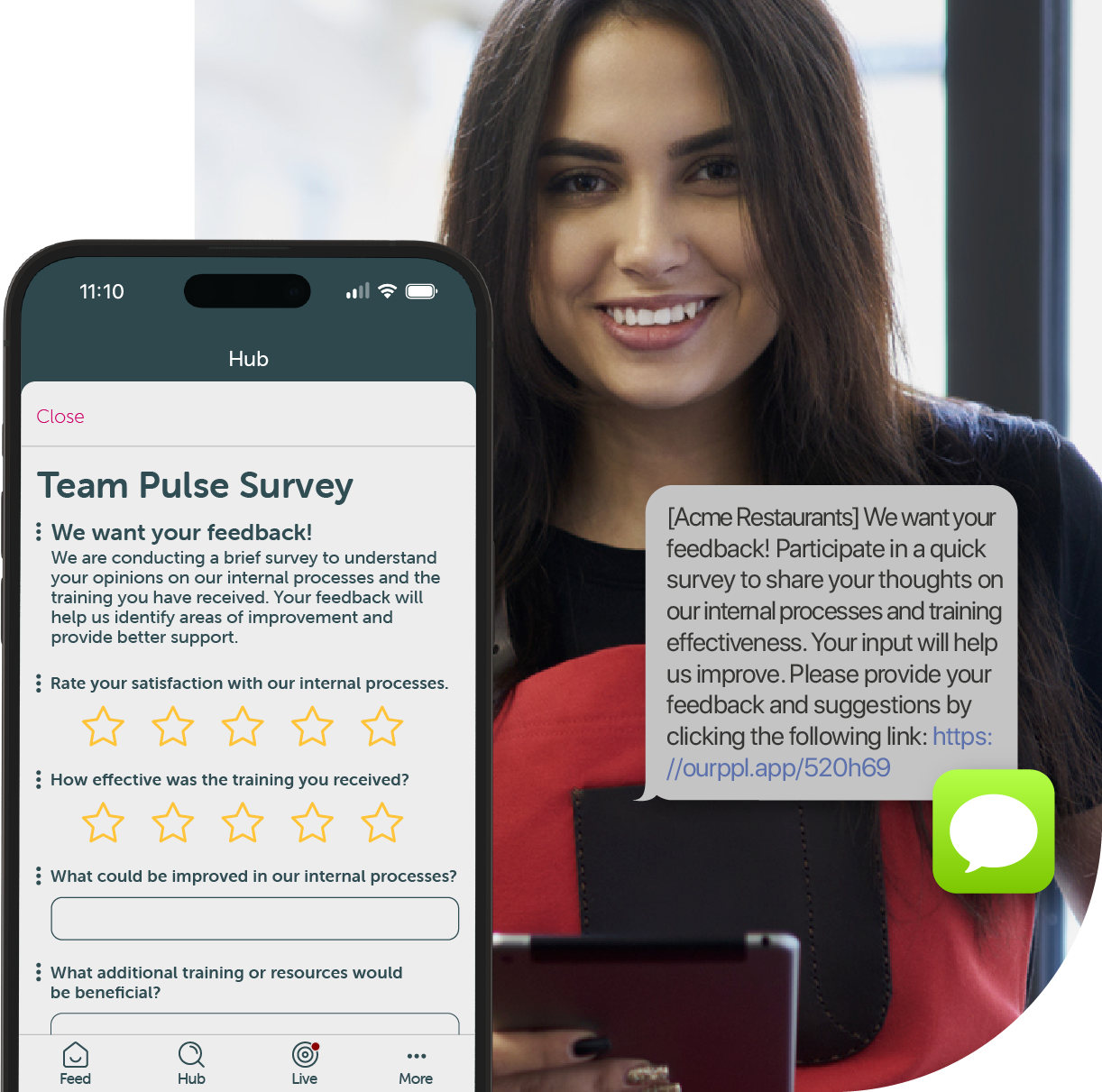 Surveys can be delivered via text or email - so employees can respond directly from their phone, with no app or login.