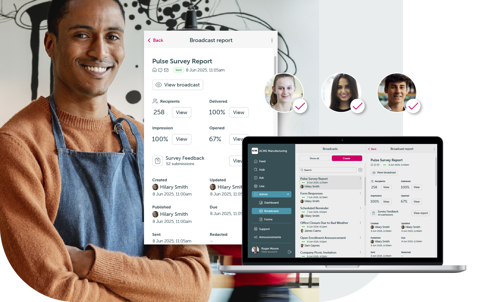 View responses instantly. Track completion rates, view trends, and take action on what your team really thinks.